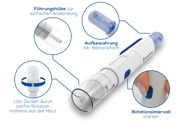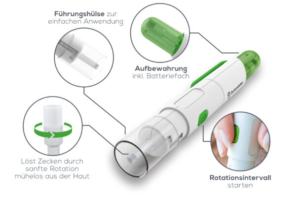 - Für alle Zeckengrößen – Verschiedene Aufsätze für Mensch, Hund & Katze.
